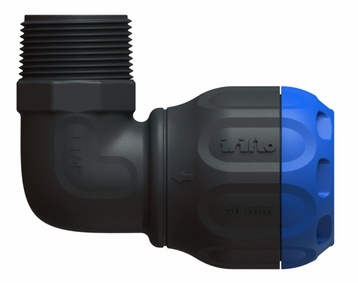 Isiflo „SPRINT“ aus faserverstärktem Polyamid Winkel-Steckverbindung AD 63 mm x 2″ AG 90°, Dichtung EPDM, für PE80, PE100, PEx der Klassen SDR11 bis SDR 17,6